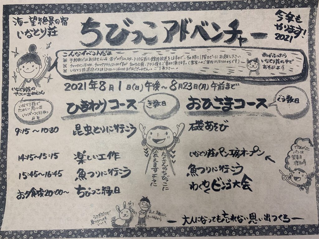 いよいよ、いなとり荘恒例の『ちびっこアドベンチャー』が始まります。 8/1の午後から ひまわりコース でお待ちいたしております。 チェックイン前でもチェックイン後でも参加出来ます。 昆虫とり・磯遊び・魚つり等スタッフと一緒に遊びましょう。 雨天...