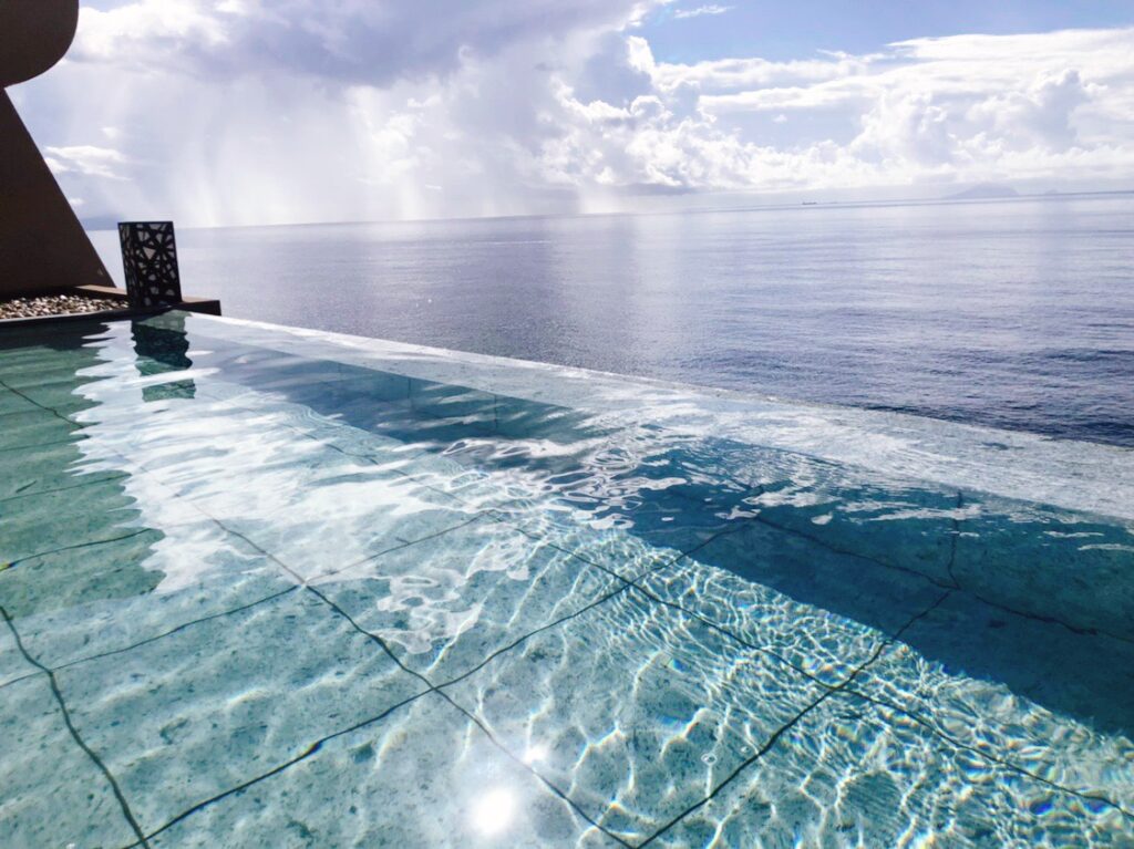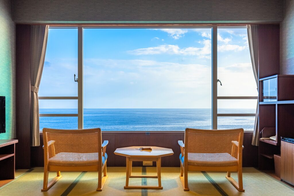 見てください、この眺め・・・ こちら、7F大浴場の露天風呂「蒼空」。 お風呂は7F、海はもちろん1F。 ですがこんなふうに海と空と自分がひとつにつながる天国。 お風呂に浸かるとこんな世界が。 普段なかなかないですよね、7Fだから空にも近い。 本当にま... -