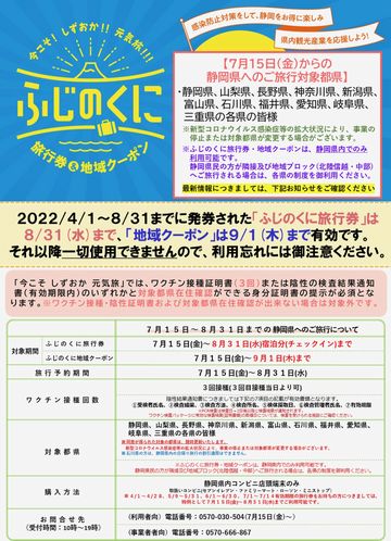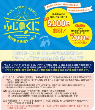 静岡県民の皆様に朗報です。 じゃじゃん なんとお得なのでしょう。 詳細は、ふじのくに静岡県の公式HPに掲載がありますので こちらをぜひご覧ください。 「いまこそ!しずおか!!げんきたび!!!」の詳細はこちらをクリック 主な内容は以下です。 ■宿泊... -