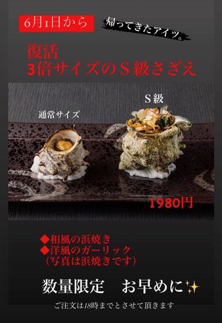 じゃじゃん そうなんです。 昨年、期間限定で爆発的人気だった S級さざえさん。 この度、6月1日から復活いたします! いつまで網にひっかかってくれるかわからないので とりあえずの7月22日までとなります。 このさざえ、通常サイズの3倍の大きさ!! 左... -