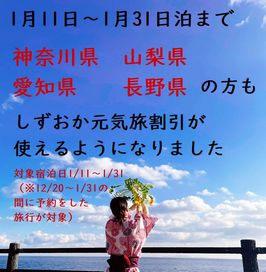 みなさんこんにちは(*'▽') 今日はお得な情報をご案内させてください。 今まで静岡県民のみ対象だった「しずおか元気旅」(通称「バイシズオカ」)。 この度、パート2として 静岡県に隣接する神奈川県・山梨県・愛知県・長野県民の方も対象となりました。... -
