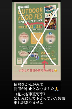 5月22日、23日に予定しておりました フードフェス、花火は中止になりました お知らせいたします 申し訳ございません。 いなとり荘 坪井 -