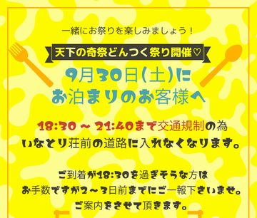 じゃじゃじゃん なんと4年ぶりに開催されるんです、 天下の奇祭「どんつく祭り」! 夕方から露天の出店あり、夕食後には20:40より目の前で花火ありと とっても楽しい1日になりそうで 地元みんなでわくわくしております。 そして、この日にお越し下さるお... -