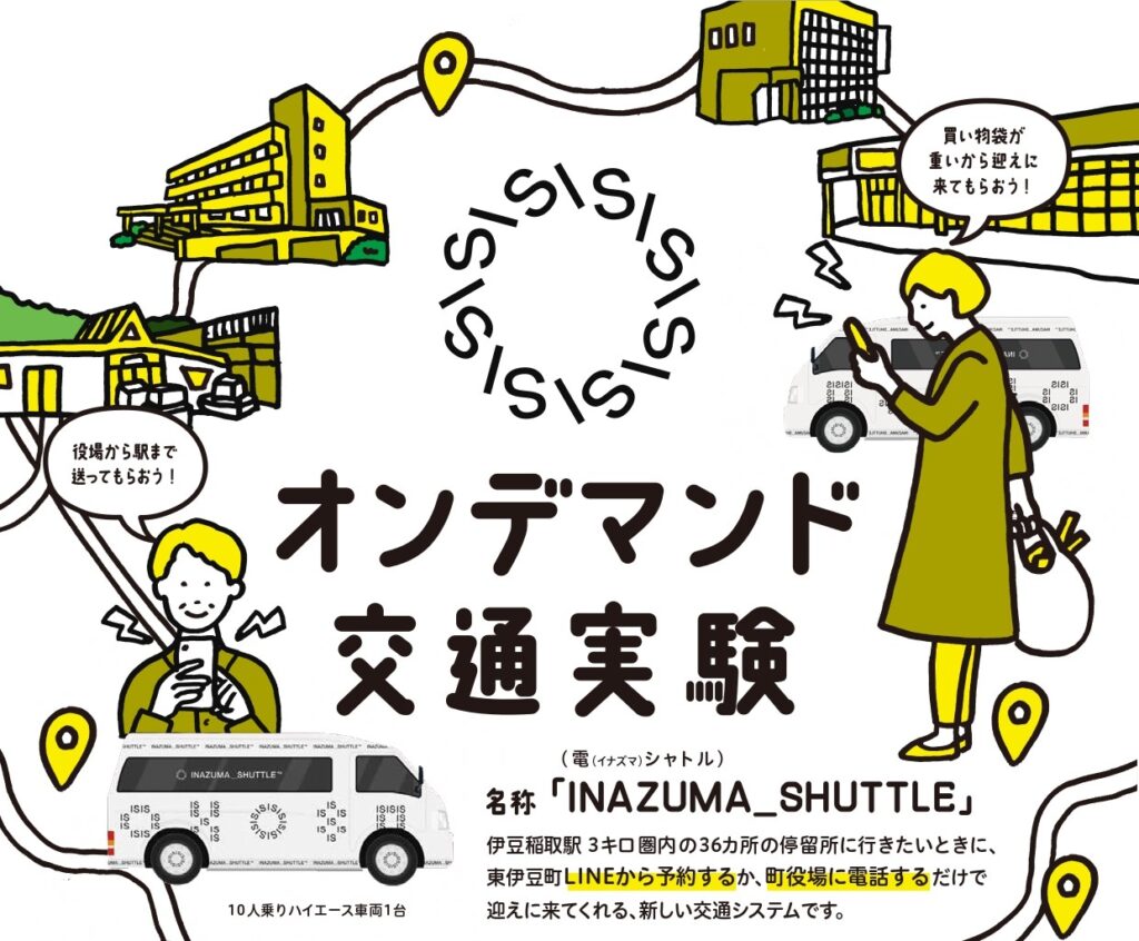 東伊豆町が期間限定で行う、オンデマンド交通実験。 2023年11月1日(水)から、2023年12月27日(水)の期間限定で、 町民、観光客の方や、ビジネスでの、利用者の行動様式にあわせて、 行きたい時に目的地に移動できる、「オンデマンド形式」の 交通の可能... -