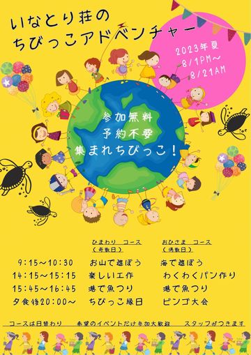 夏休みが近づいて参りましたので、再度投稿させて頂きます♪ ていっ 毎年恒例の夏休みイベント ちびっこアドベンチャーの日程が決定しました。 お問い合わせを頂いていた皆様、大変お待たせいたしました。 いなとり荘のちびっこアドベンチャーは、 いなとり... -