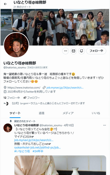 じゃじゃじゃん こちら、いなとり荘の公式Twitter。 ・・・・・・ではなくて、いなとり荘総務部の公式Twitter。 そうなんです、いなとり荘内のいろんなこと、会社としての情報も UPしていこうと総務の榎本がはじめました♪ 山中もたまにちょびちょびと参加... -