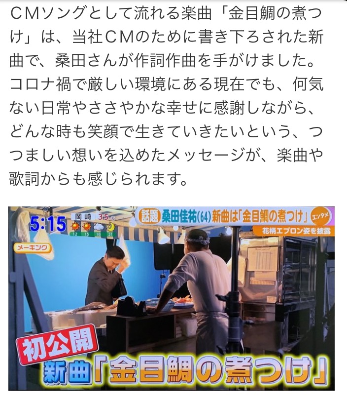 桑田さんも曲にした金目鯛、ぜひ召し上がりに来て下さい♪