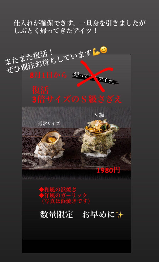 このS級さざえ、今までの別注お料理の中でダントツで人気なんです。