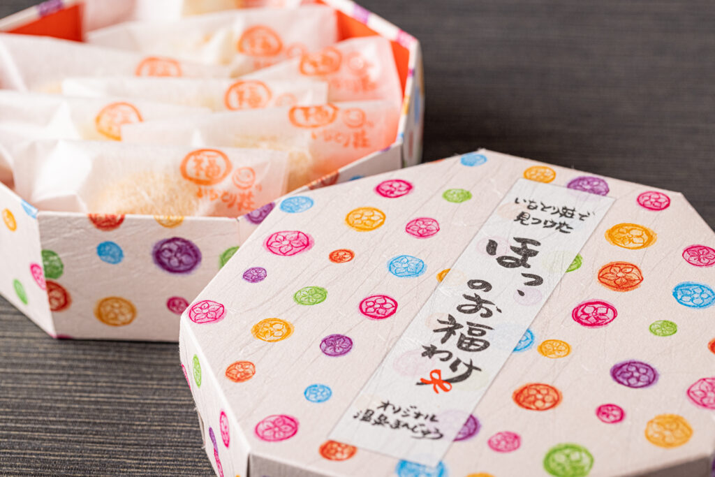 いなとり荘オリジナル饅頭をお召し上がりいただいております。
