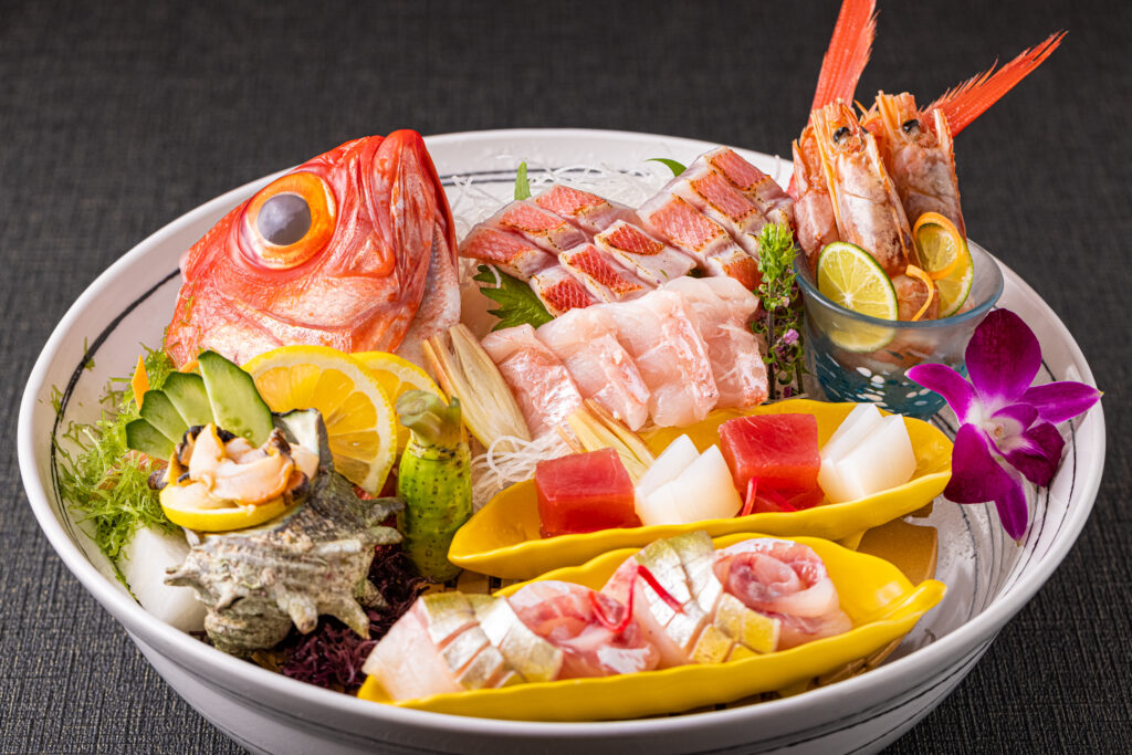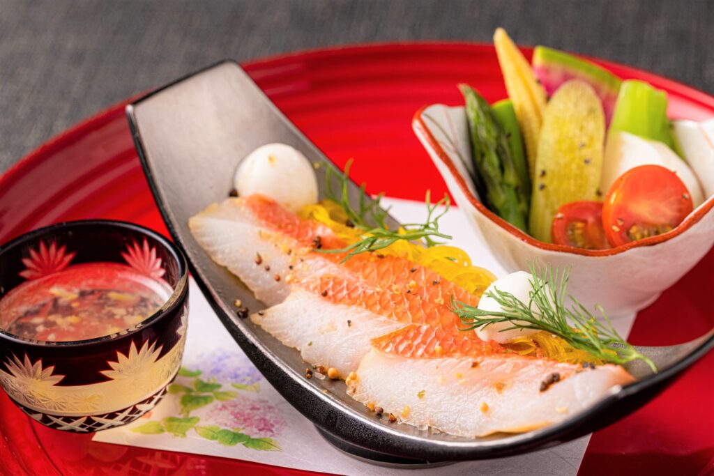 前半で紹介した姿造りの「金目鯛ざんまいプラン」の前菜がこちらなんです。