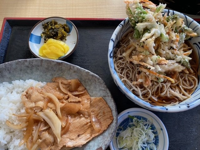 またまた違う日のランチ、かき揚げ蕎麦と生姜焼きライス。