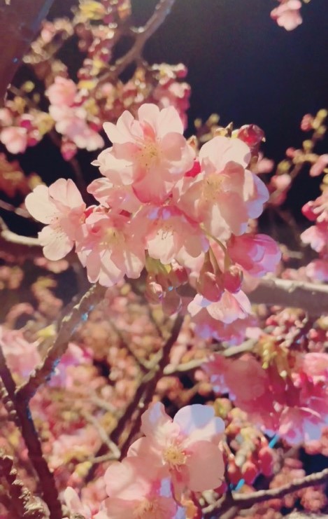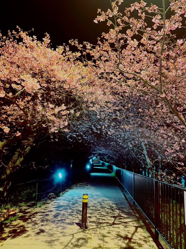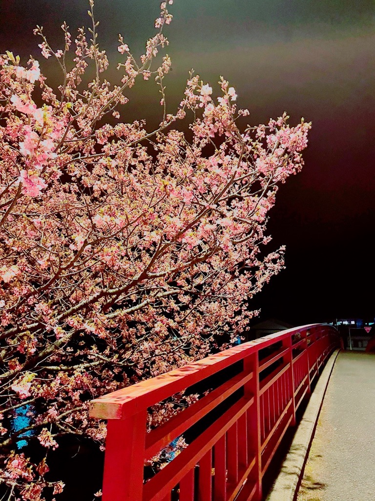 河津の桜並木は、川の沿いにずっと咲いているので夜はとても冷えます。