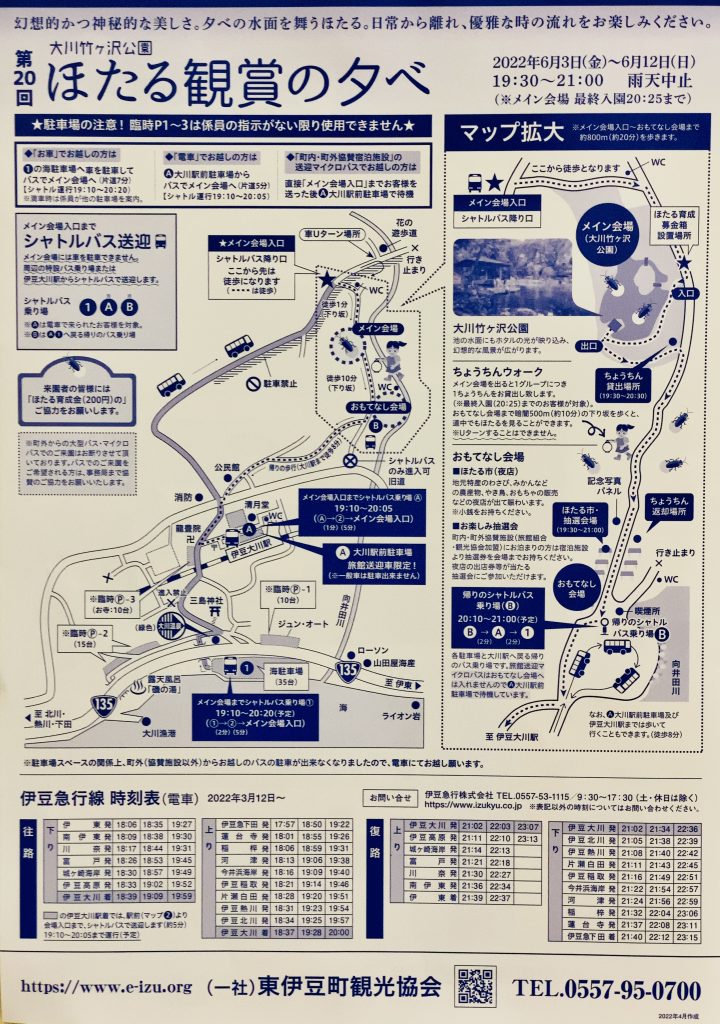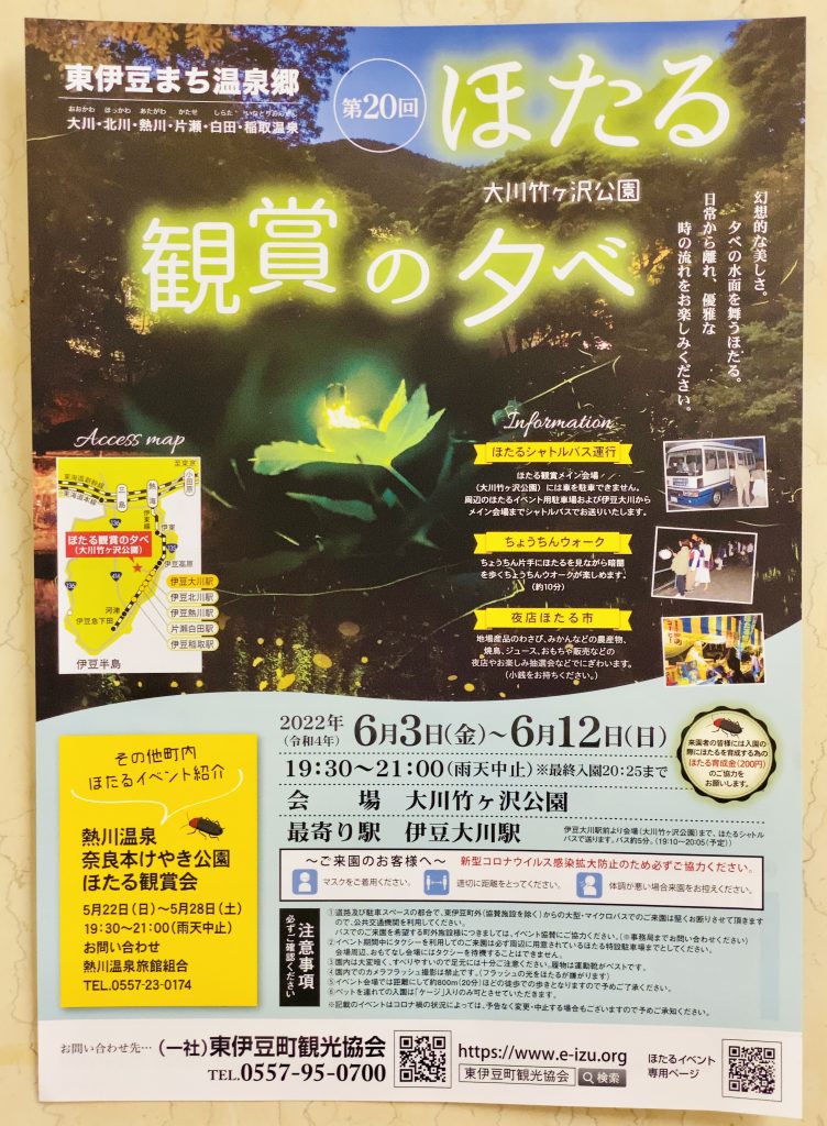 伊豆大川の大川竹ヶ沢公園で、「ほたる観賞の夕べ」が6月3日(金)~6月12日(日)、