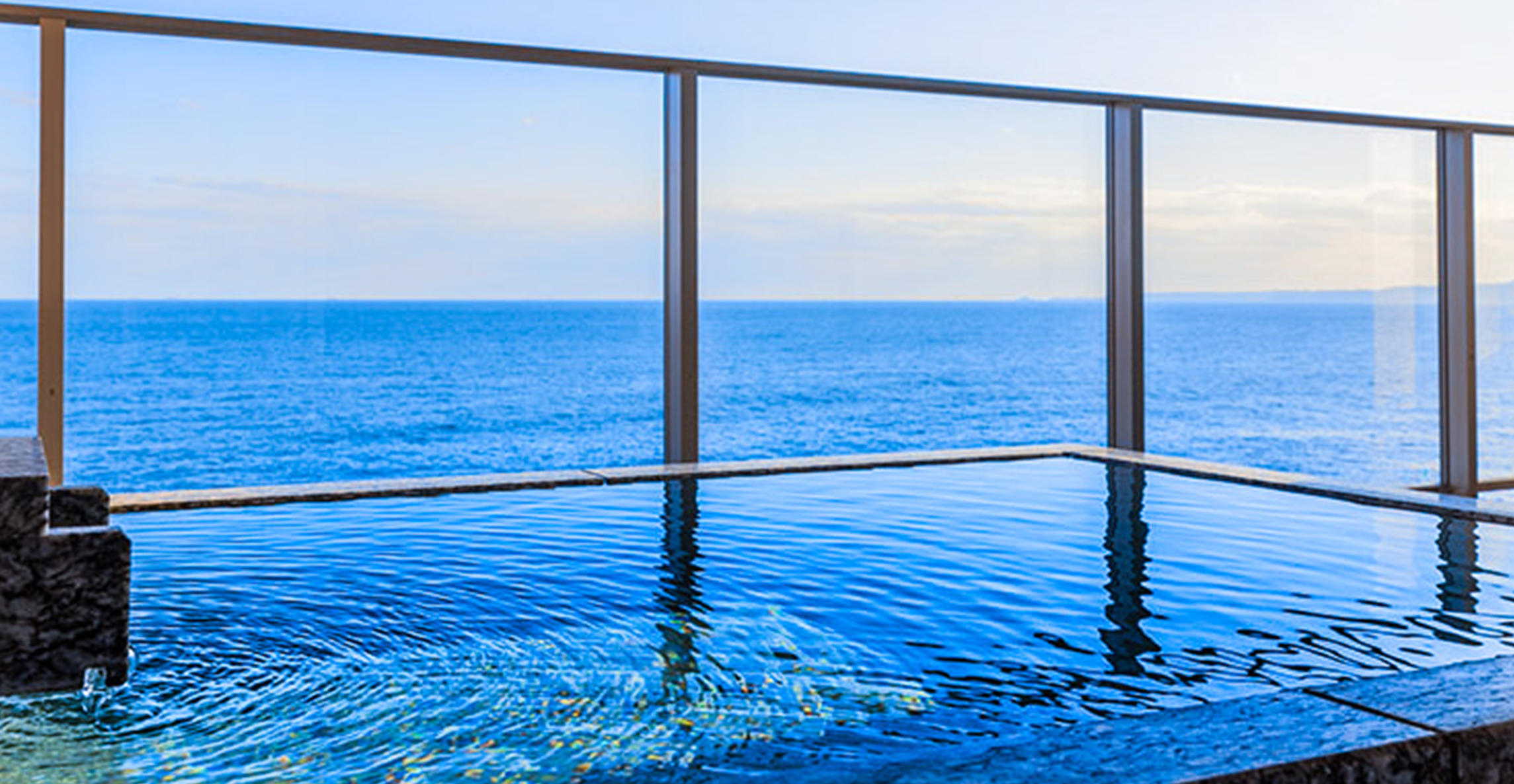 間取り:寝室+リビング+ホール+展望バルコニー+露天風呂+シャワーブース+ベッド(シモンズ)+洗面