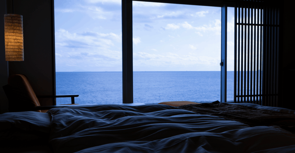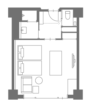 間取り:寝室(シモンズ製ツインベッド)+リビング+シャワーブース+洗面