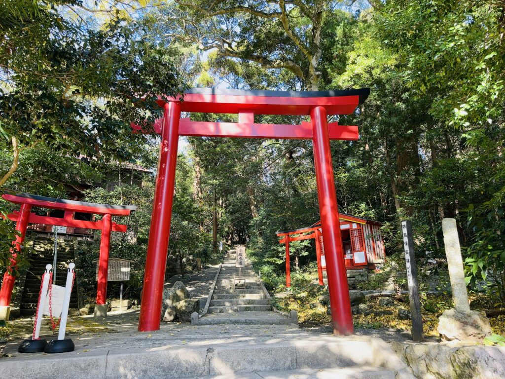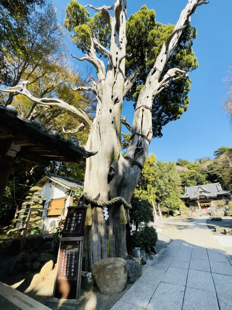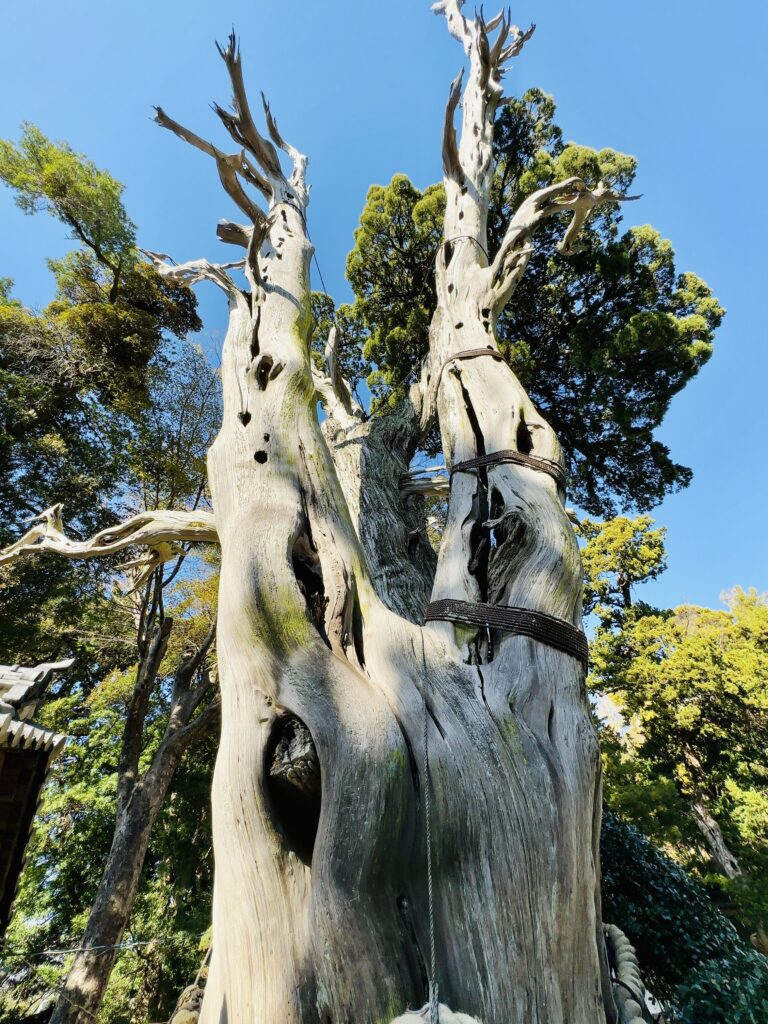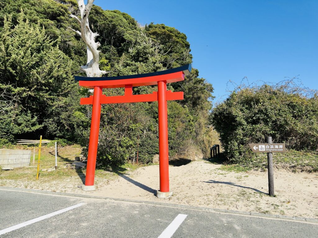 境内には、なんと樹齢2000年の巨木がそびえたっていて、神社の裏には白砂の海岸、サーフィンで有名な白浜海岸があります。