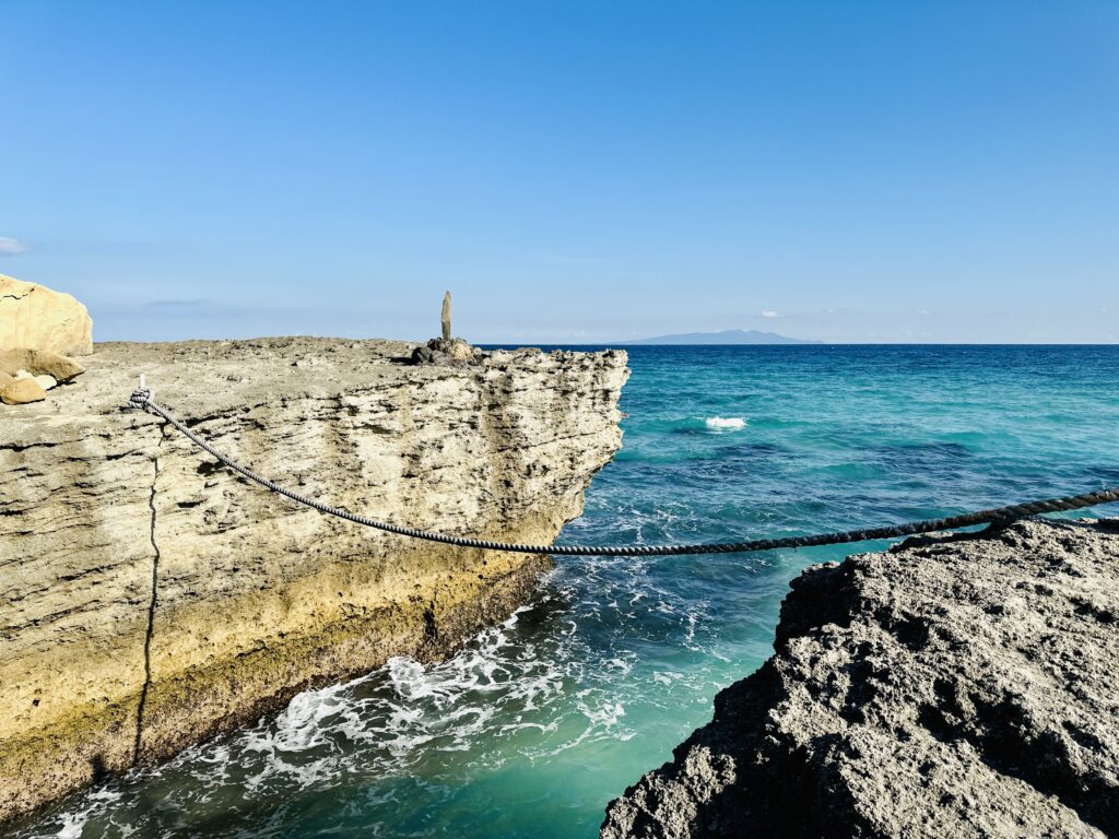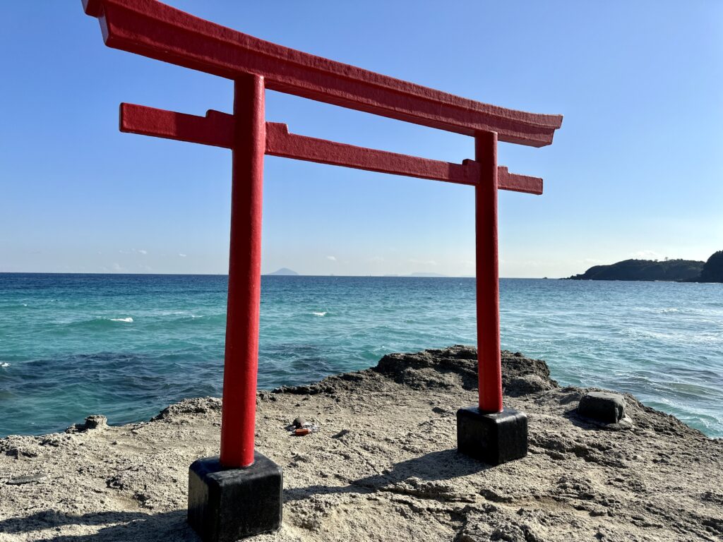 駐車場の奥の鳥居をくぐって、海岸へ歩いていくと、海岸の岸には鳥居がそびえたってます。