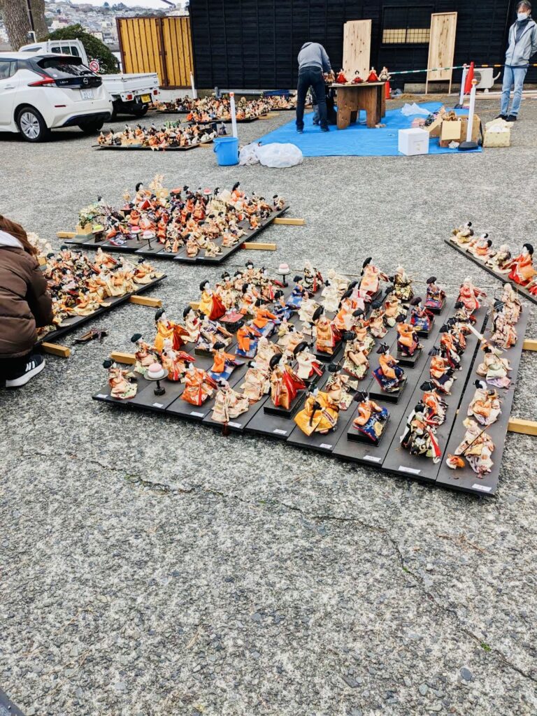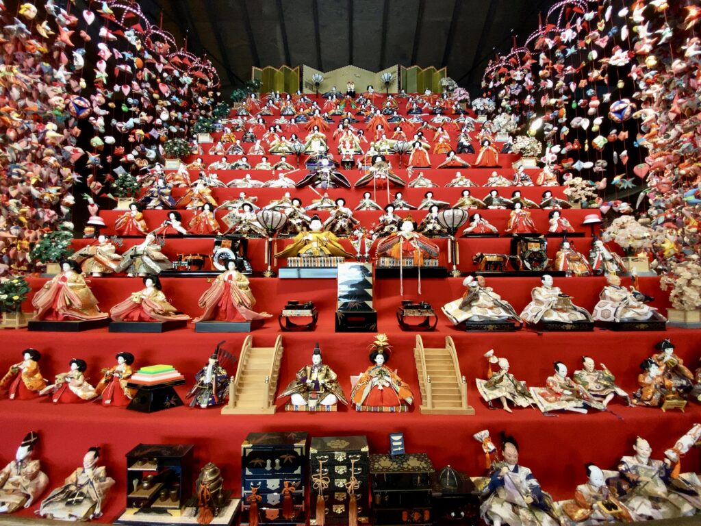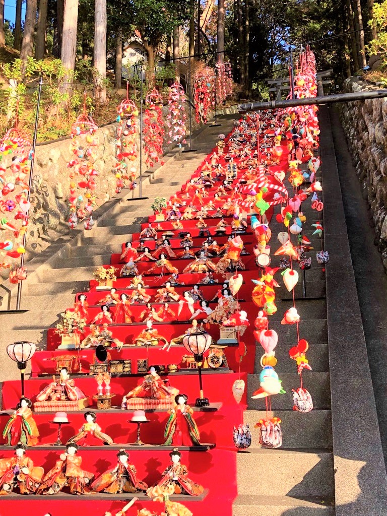 神社の百十八段の階段に飾られるお雛様たちと雛のつるし飾り、圧巻の光景です!!