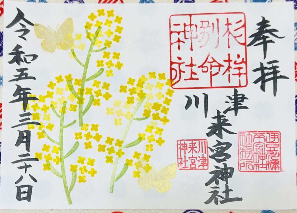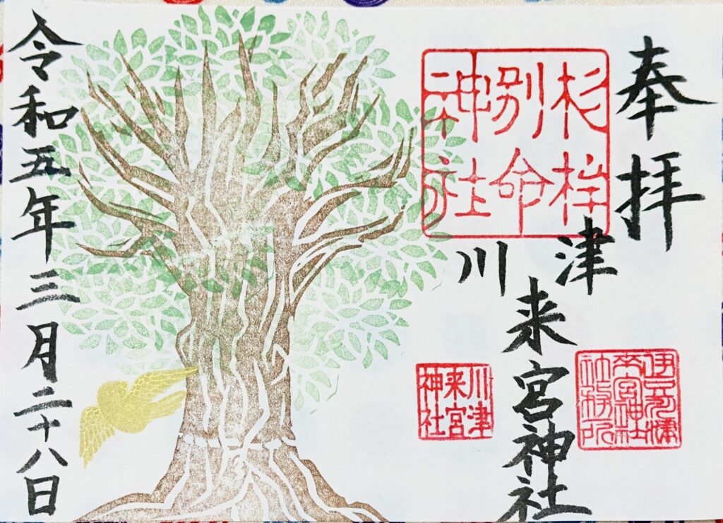 通常の御朱印の他、見開き型の大楠の御朱印、季節折々期間限定の見開き御朱印・切り絵の御朱印があります。
