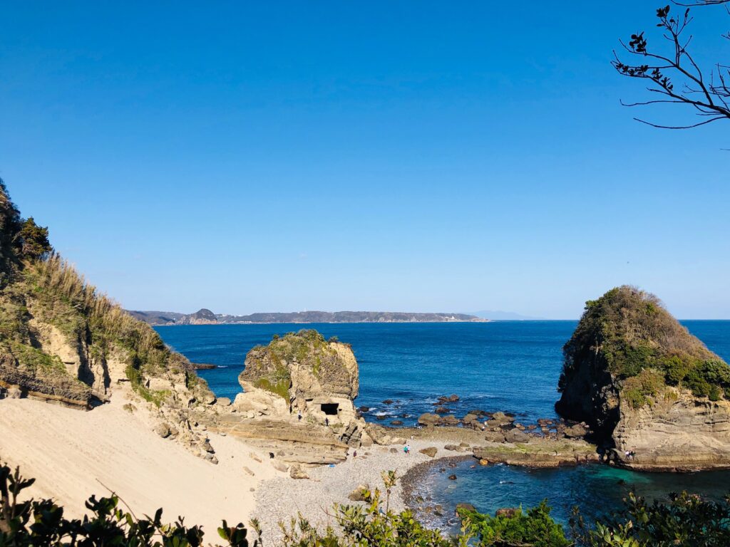 さらに奥まで遊歩道を歩くと… 龍宮窟の手前にある、田牛(とうじ)サンドスキー場が見えます。