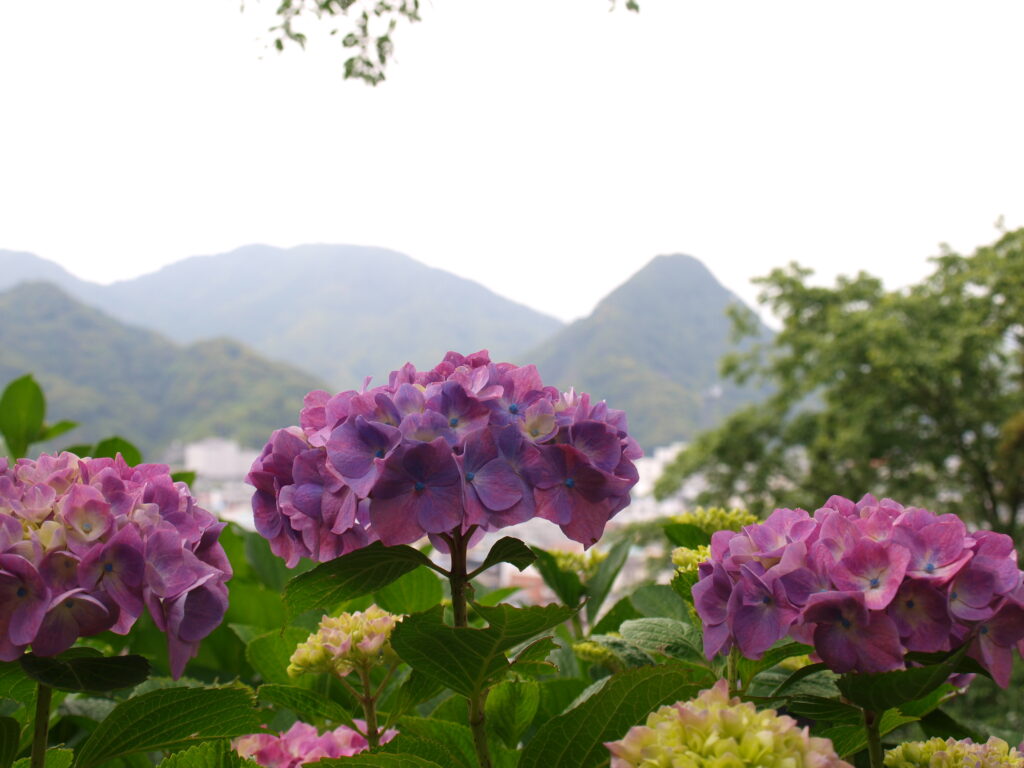 奥まで散策すると、あじさいの群生地が広がっていて、また山頂までいくと、紫陽花の向こうに下田の海と町並みを見下ろす事が出来ます♪