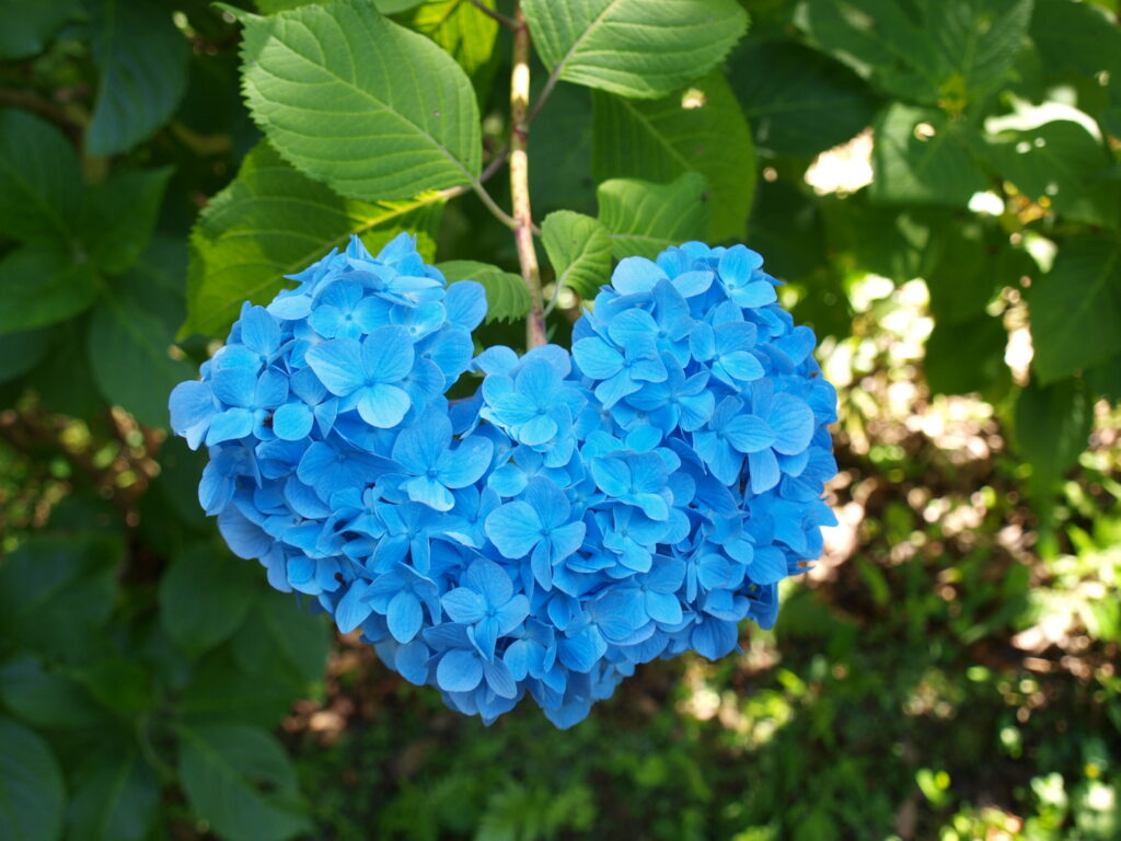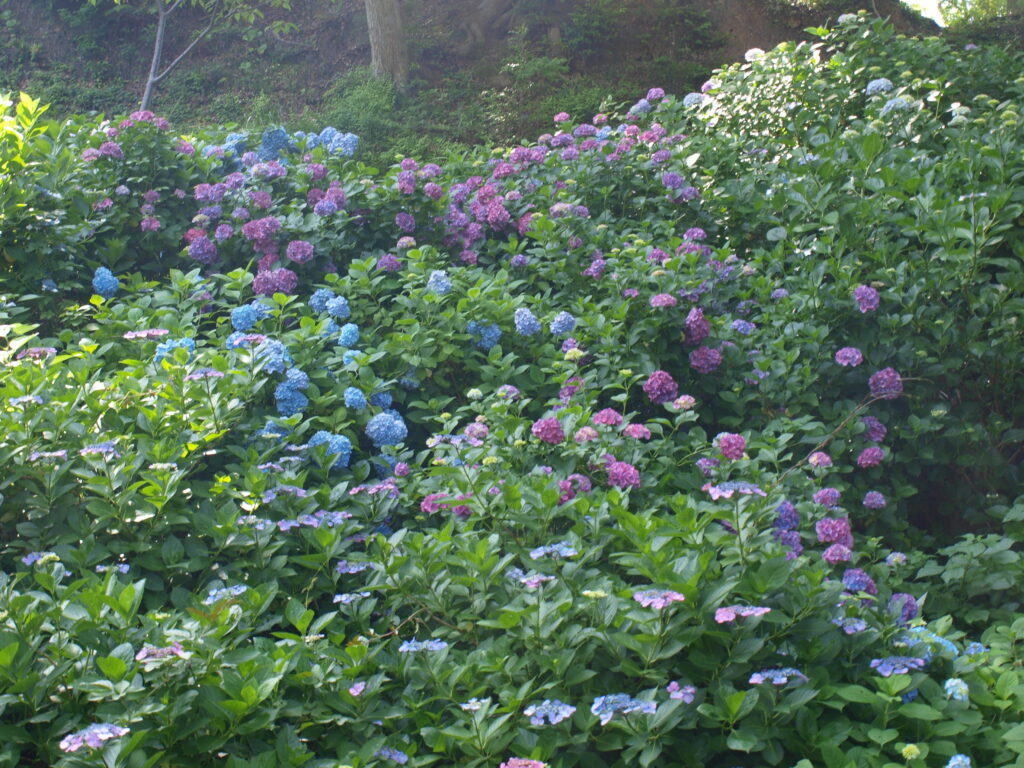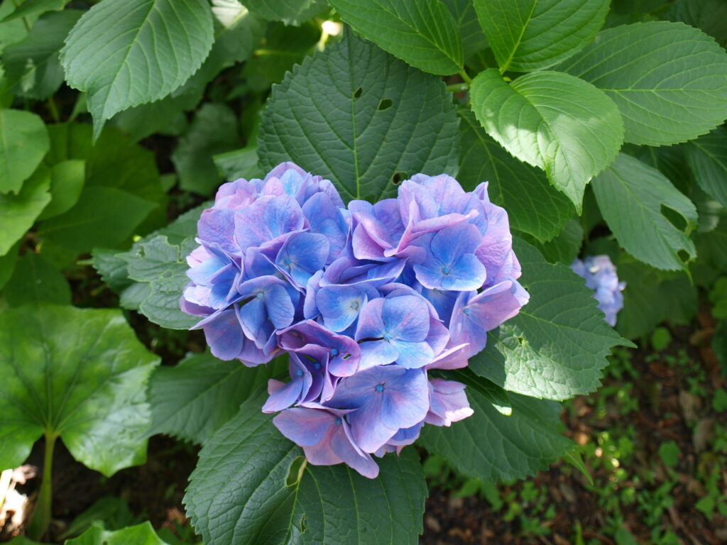 土壌によって花の色が変わり、白色・青色・紫色・赤色…とあり、また同じ花の株でも部分によって、根から送られてくるアルミニウムの量によって差があるそうで、同じ色でも濃かったり薄かったり、色が別々だったりします。