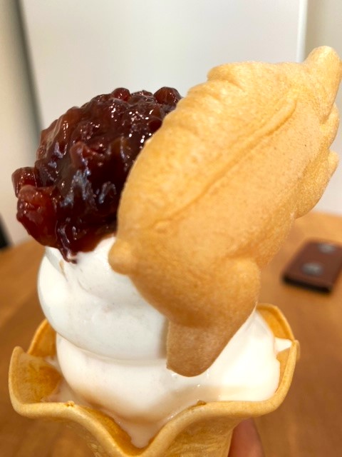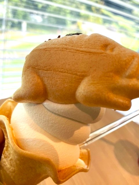 可愛い猪の形のモナカが乗ったソフトクリーム。