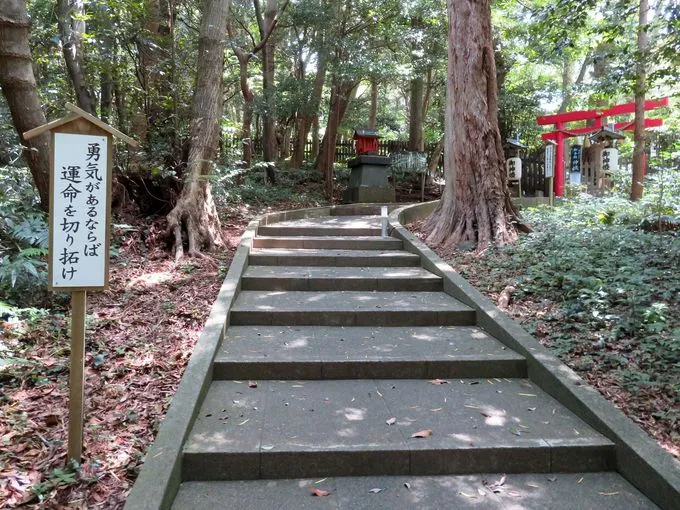 拝殿から本殿に向かう階段参道は、とても気持ちが良いです。木々の緑が目に優しく、心に響く言葉が書かれた立札があります。本殿は大正時代に建てられた総ヒノキ造りで、とても立派です。ここでは、伊古奈比咩命と三嶋大明神が祀られています。伊古奈比咩命は愛と知恵と美の女神様で、三嶋大明神は勇気と繁栄発展の神様です。二人は恋人同士でしたが、三嶋大明神は他の女性とも関係を持ってしまったため、伊古奈比咩命は悲しみのあまり自ら命を絶ってしまいます。その後、三嶋大明神は後悔して伊古奈比咩命を救おうとしますが、間に合わず・・・という悲恋の物語です。