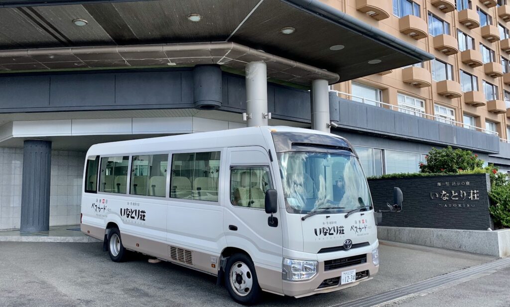 このバスは、いなとり荘に泊まるお客様を最寄りの駅からピックアップしたり、お見送りしたりしてくれるんですよ。