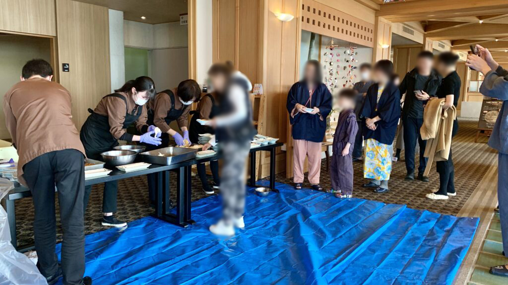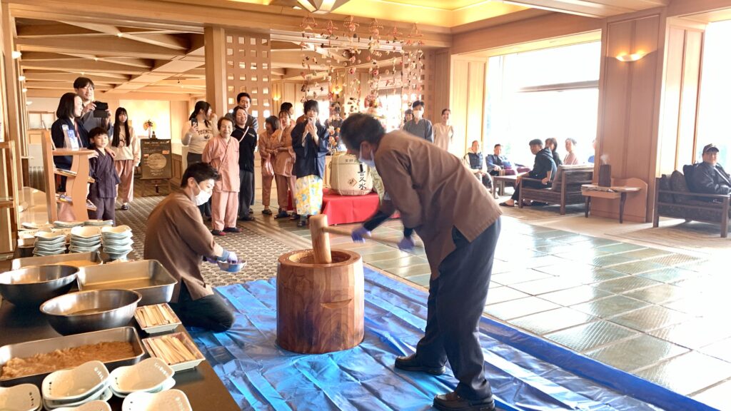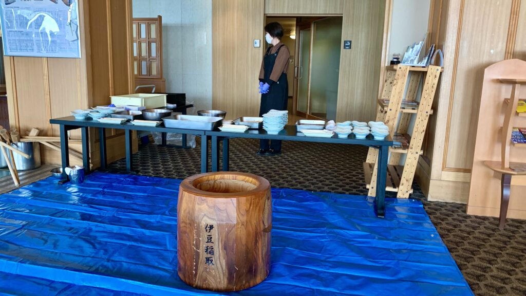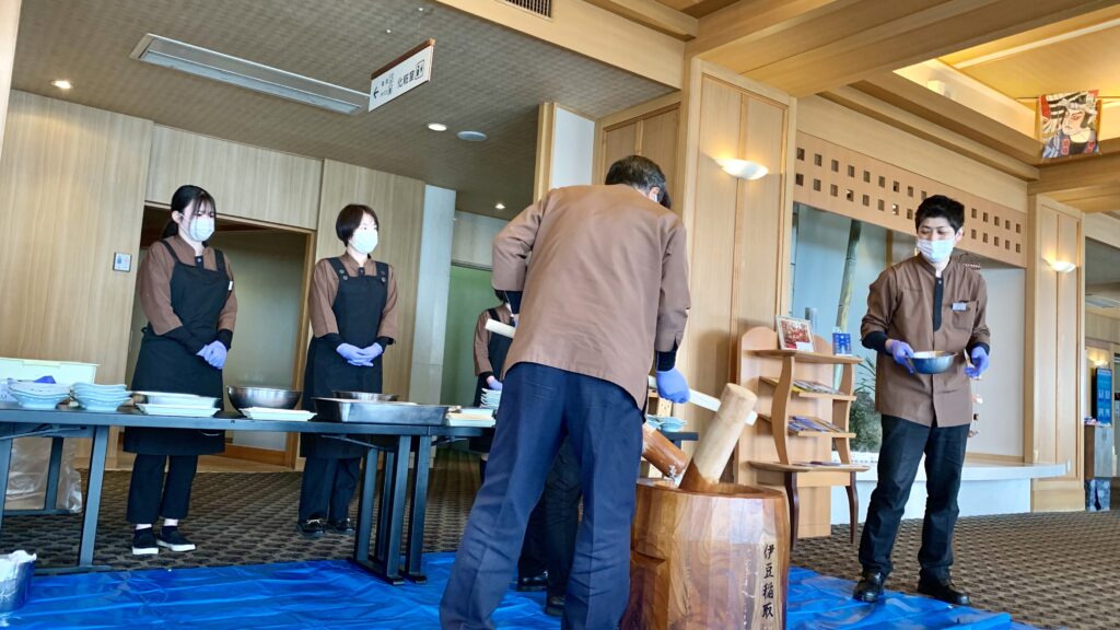 午前中にロビーに餅つき台を設置し、スタッフがお米を炊いてお餅を作ります。