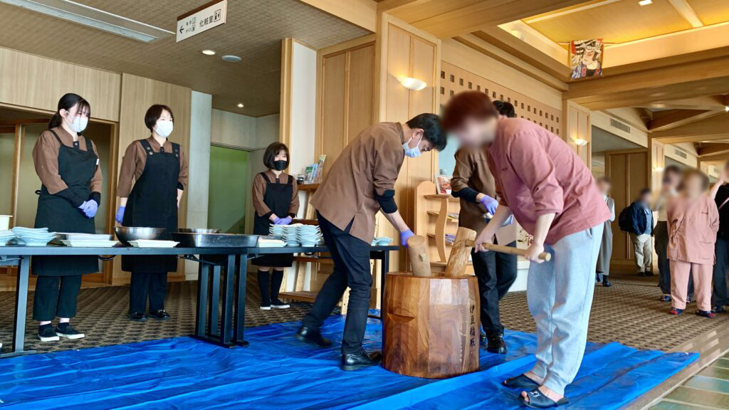 その間に、お客様は自由に参加して、杵や臼を使ってお餅をついたり、形を整えたりします。