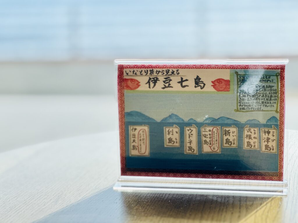いなとり荘の館内1階ラウンジには、いなとり荘から見える伊豆七島の手作り案内POPを置いてます。