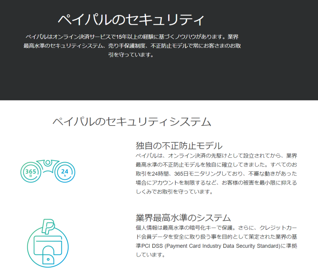 – ペイパルは、お客様のクレジットカードや銀行口座の情報を暗号化して保護します。また、不正な取引や不履行に対しては、購入者保護制度や売り手保護制度で補償されます。