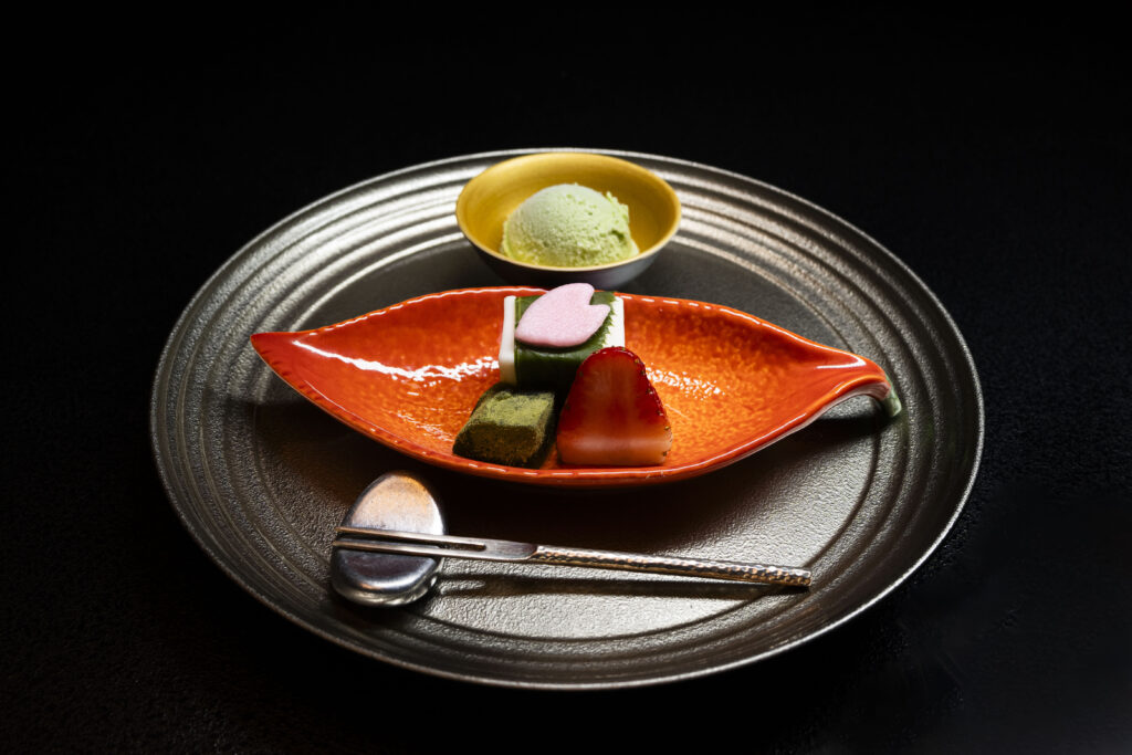 このデザートは、嶺国豆腐を使っています。豆腐の優しい味わいと、桜の香りが絶妙にマッチしています。ちなみに、嶺国豆腐は牛乳とチーズが固まったものです。