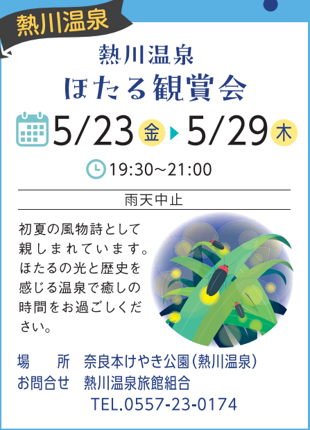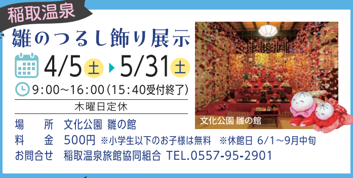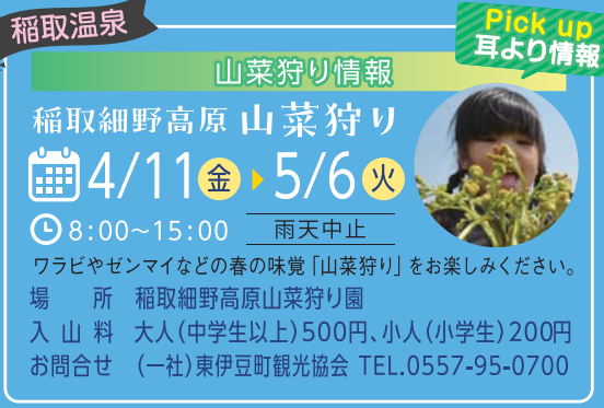 春から夏へ、自然とふれあい、思い出づくりにぴったりのイベントが目白押しのいなとり荘周辺。ご家族やご友人とぜひ楽しいひとときをお過ごしくださいね。