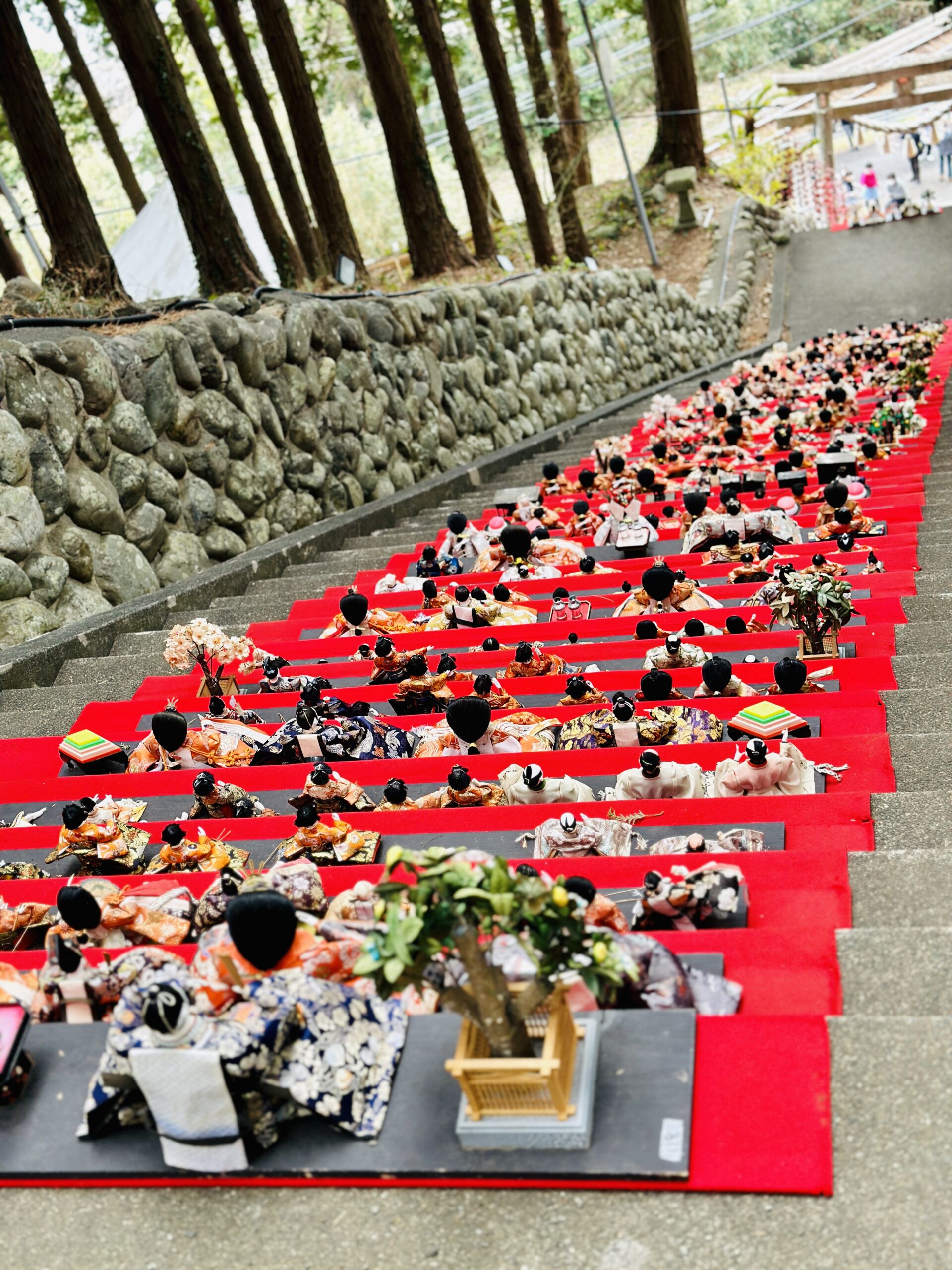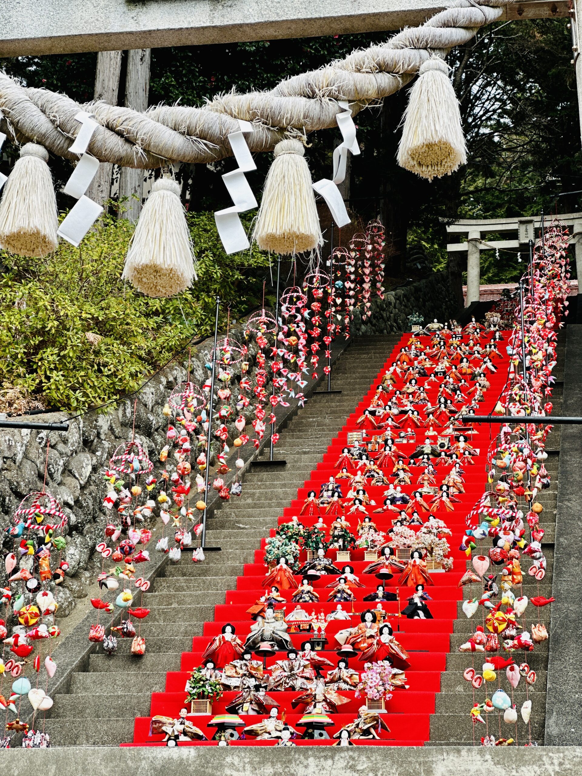 神社の118段ある階段に、雛人形とつるし飾りを展示。